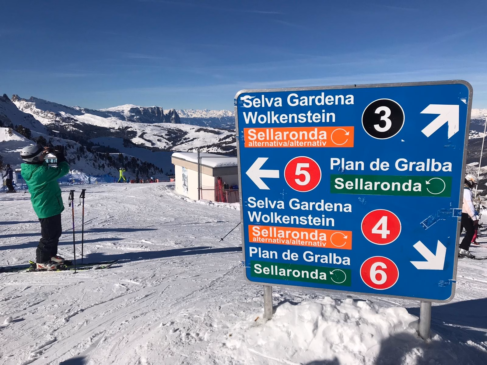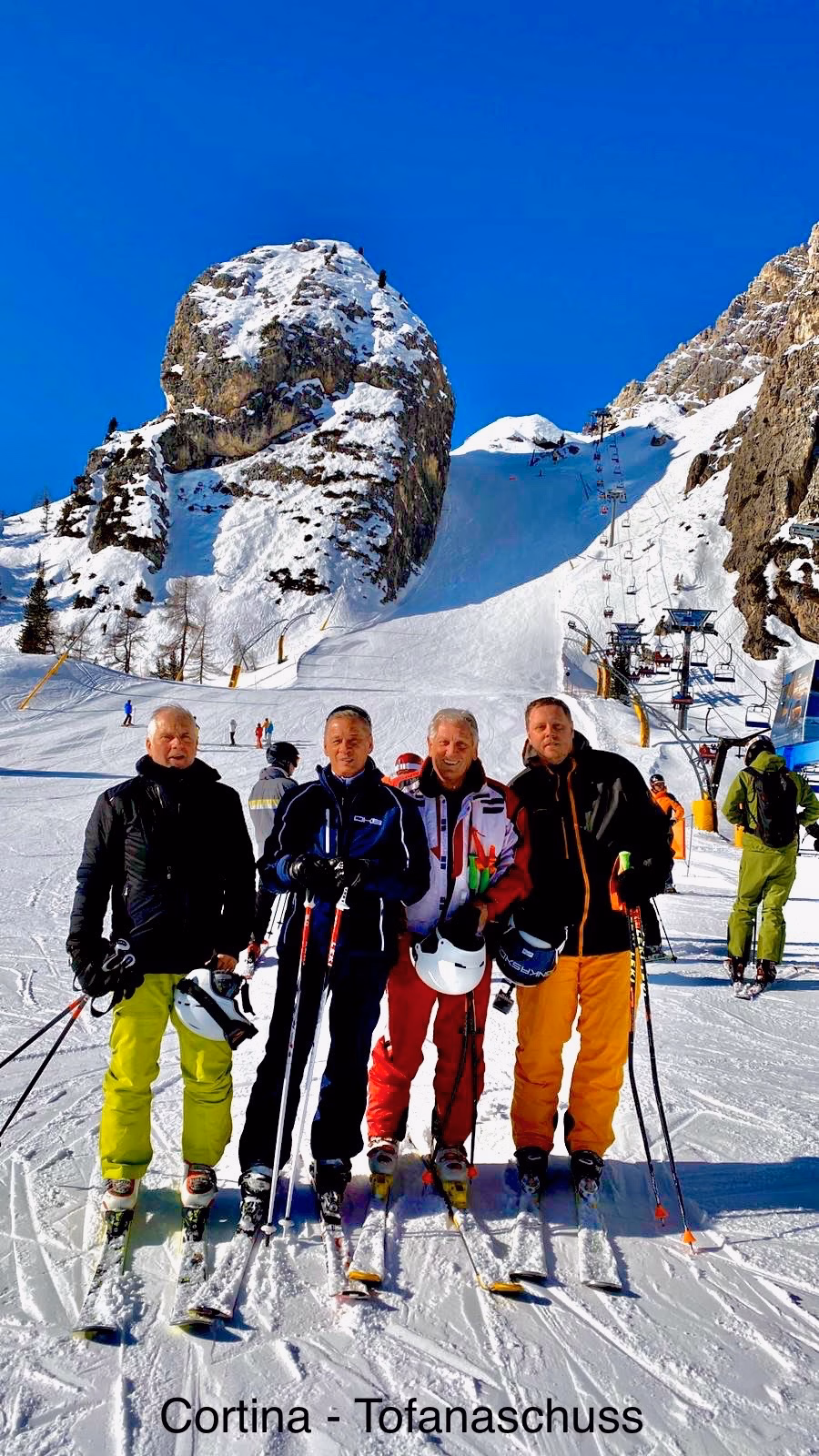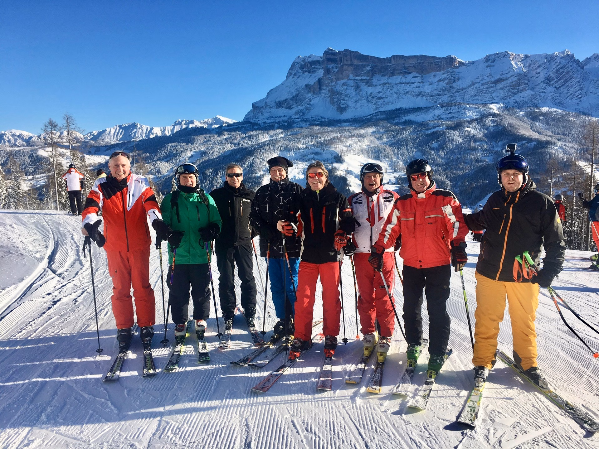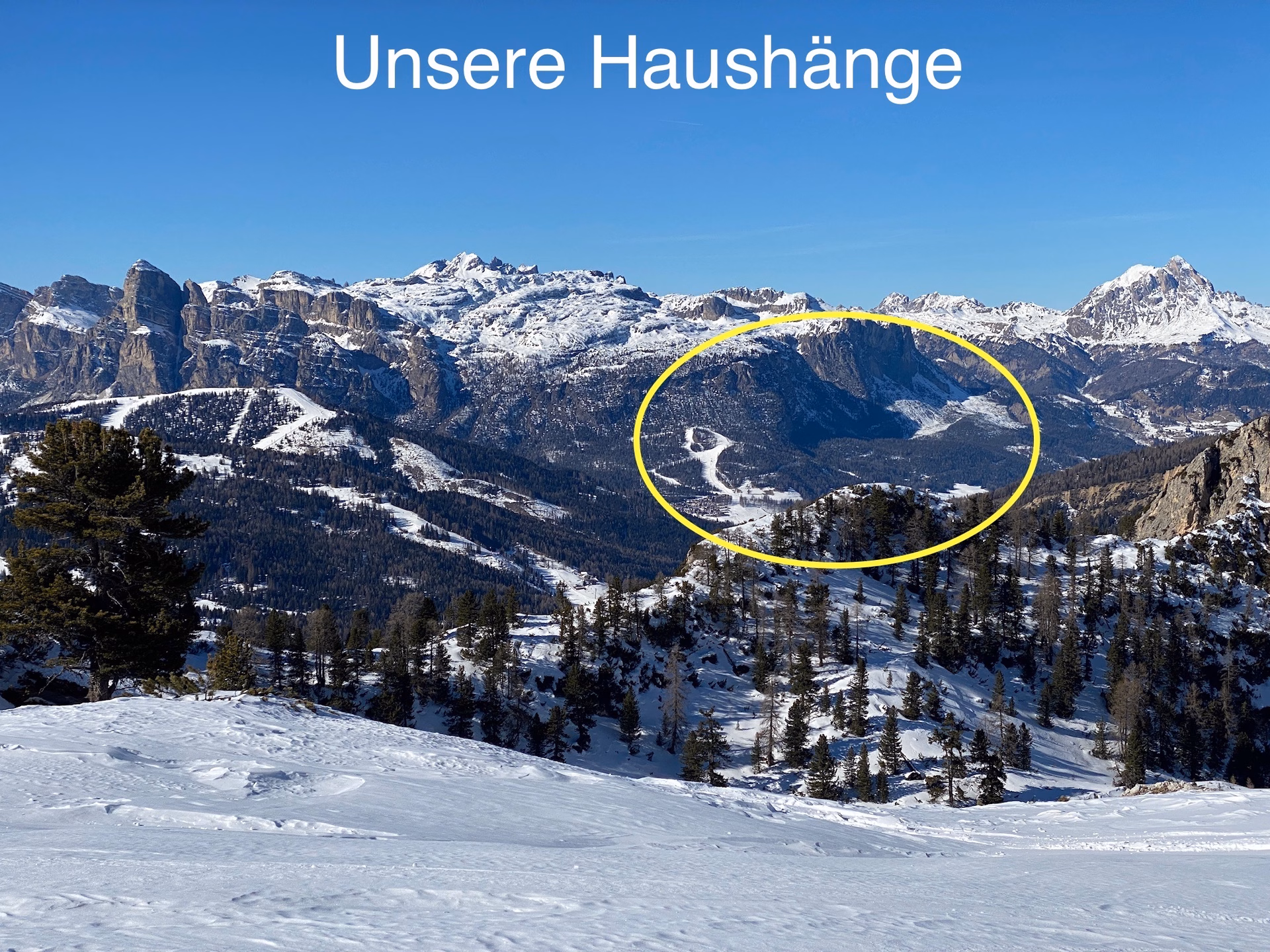 Klasse Abfahrten warten uns auf den Haushängen nach Heiligkreuz, bei der Sella Ronda, am Falzarego Pass mit der Super 8 an den Cinque Torri oder in Cortina d‘ Ampezzo!