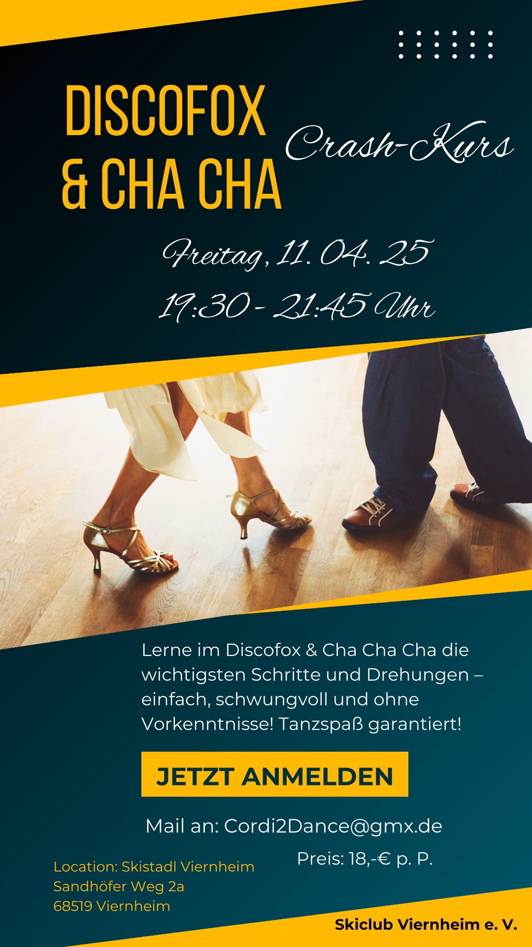 Lerne im Discofox & Cha Cha Cha die wichtigsten Schritte und Drehungen – einfach, schwungvoll und ohne Vorkenntnisse! Tanzspaß garantiert!